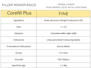 Corefill Plus é un filler monofasico di acido ialuronico reticolato (24mg HA) e lidocaina cloridrata (0,3%) di origine non animale, indicato per il riempimento di rughe superficiali, moderate e profonde. La particolare tecnica di produzione consente di ottenere un filler di elevata purezza, uniforme, plasmabile e di facile estrusione.